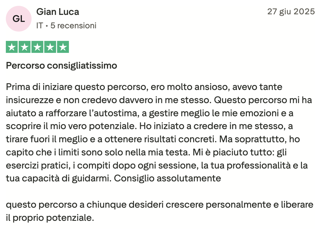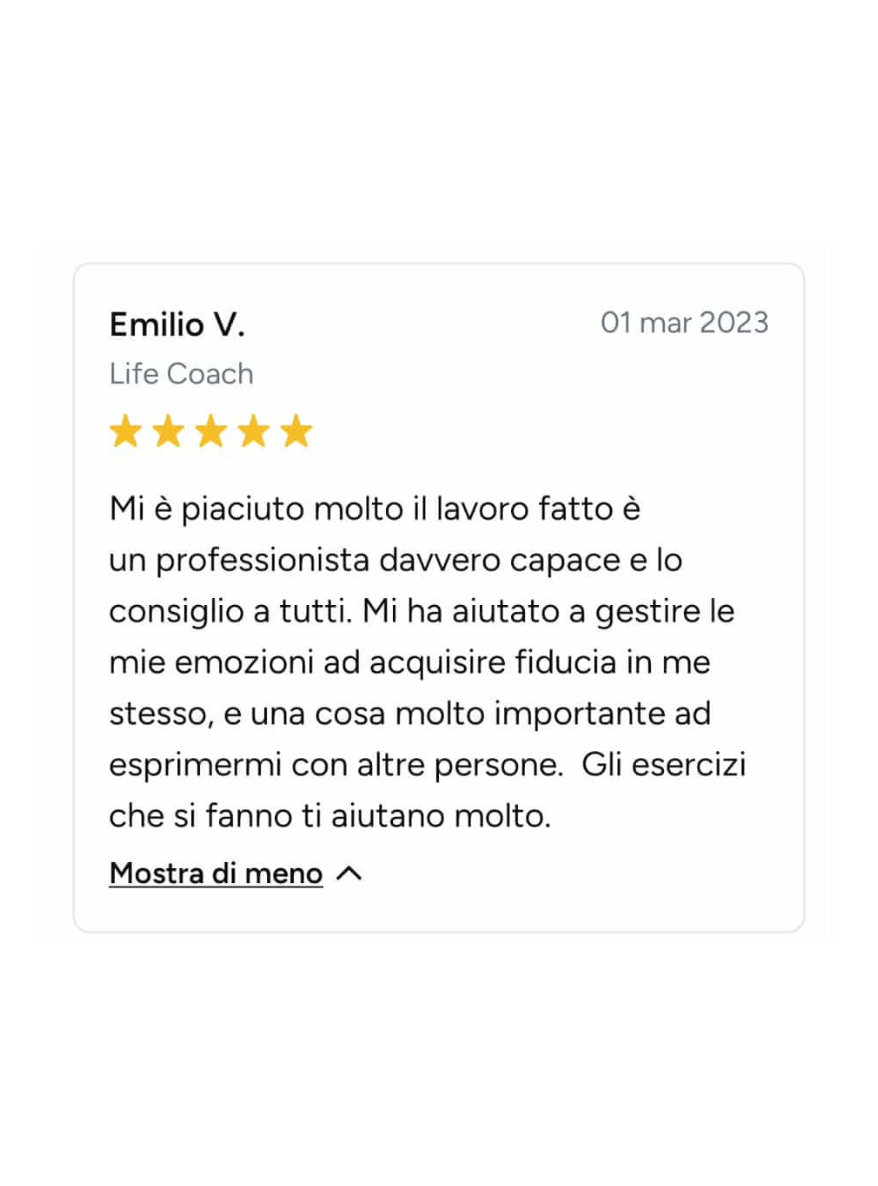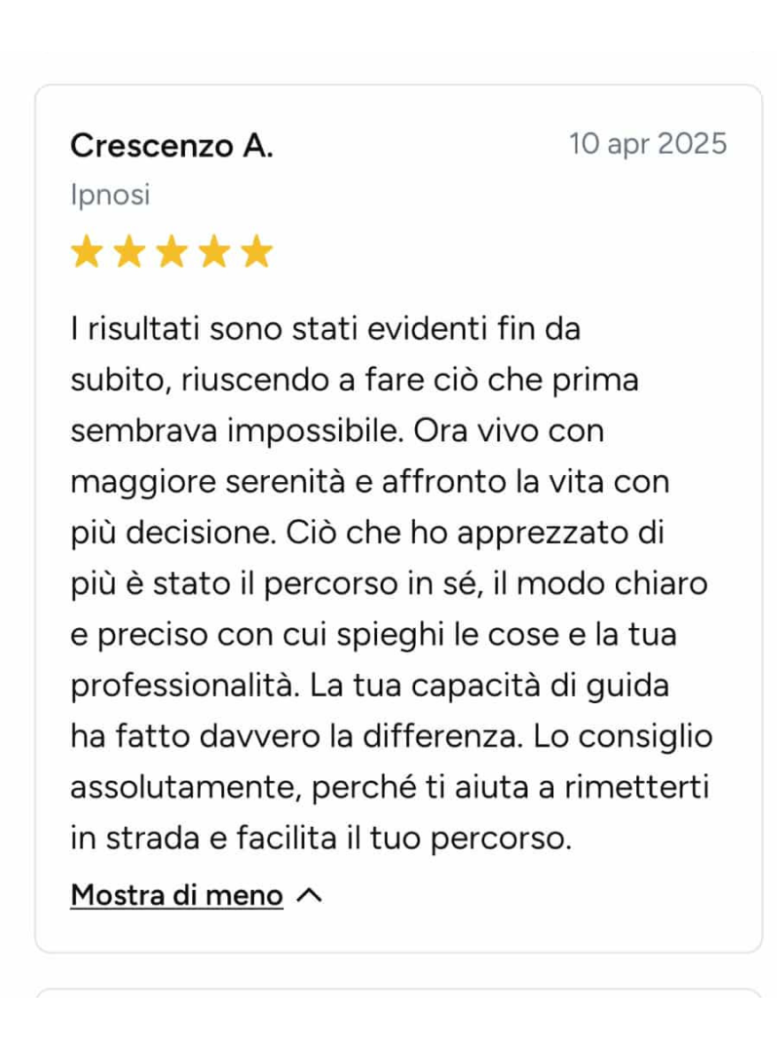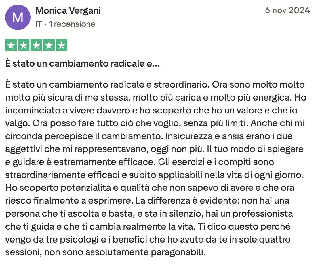 Ero bloccata, ferma in un loop e vedevo solo nero. Sembra esagerato, ma non lo è: Angelo mi ha fatto rivedere i colori! Non li vedevo da tanto tempo. Sono molto più propositiva, penso più positivo ed è tornata la speranza. Ve lo consiglio, vi aiuterà molto. In soli 15 giorni mi ha aiutato veramente tanto.