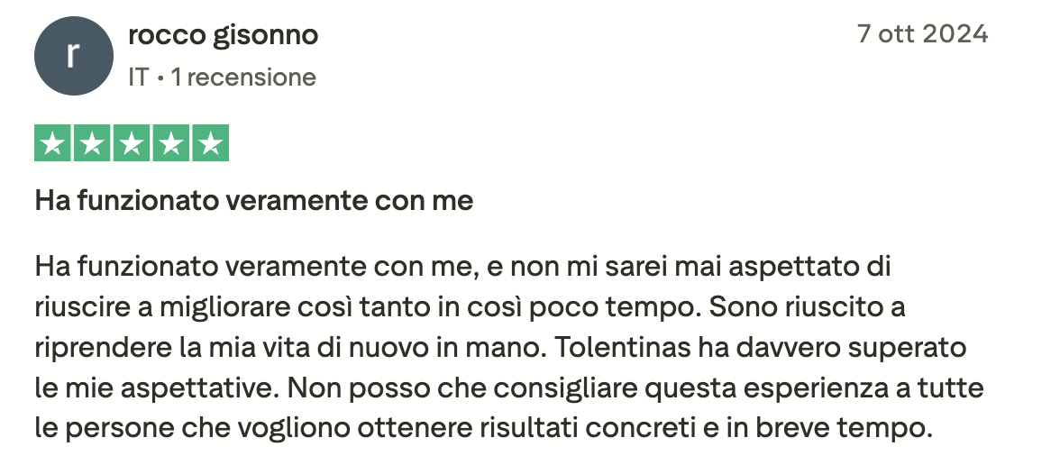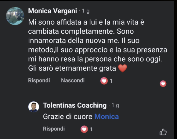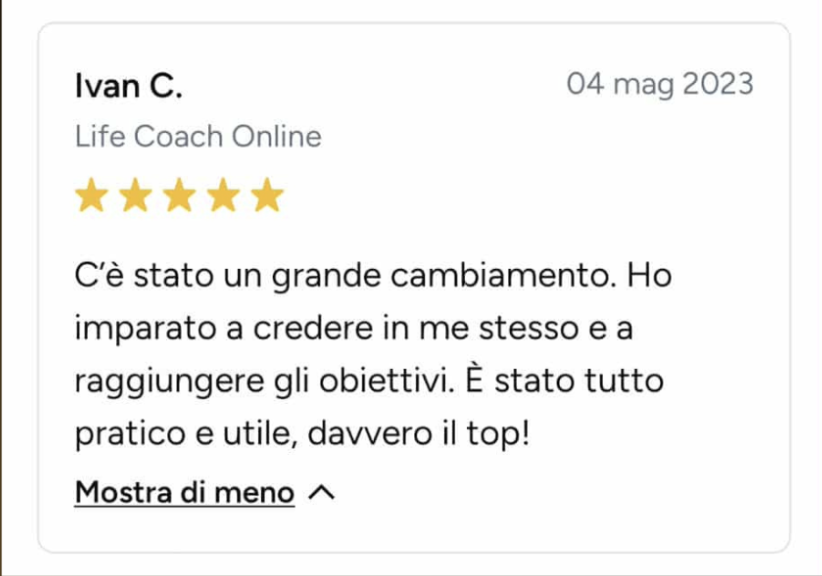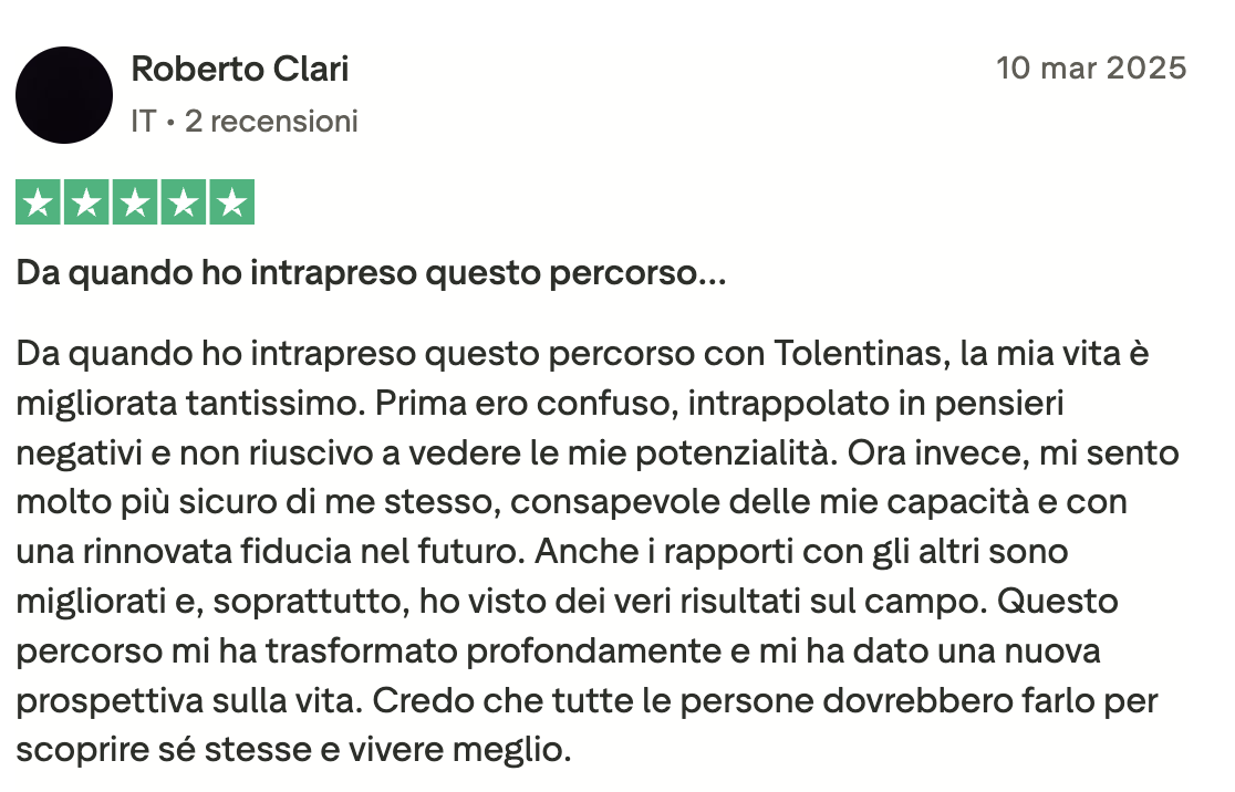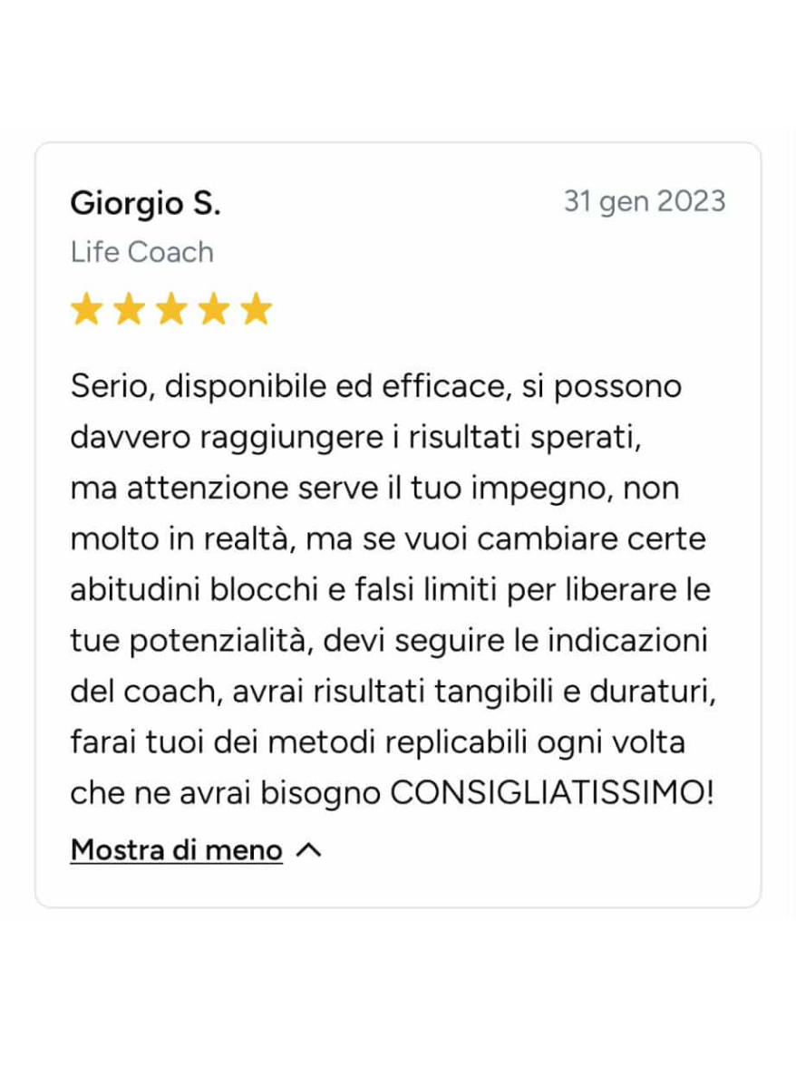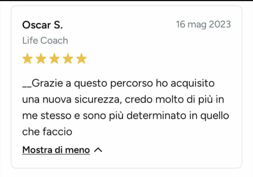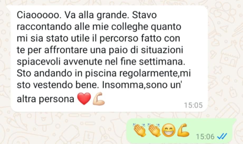 Ero bloccata, ferma in un loop e vedevo solo nero. Sembra esagerato, ma non lo è: Angelo mi ha fatto rivedere i colori! Non li vedevo da tanto tempo. Sono molto più propositiva, penso più positivo ed è tornata la speranza. Ve lo consiglio, vi aiuterà molto. In soli 15 giorni mi ha aiutato veramente tanto.