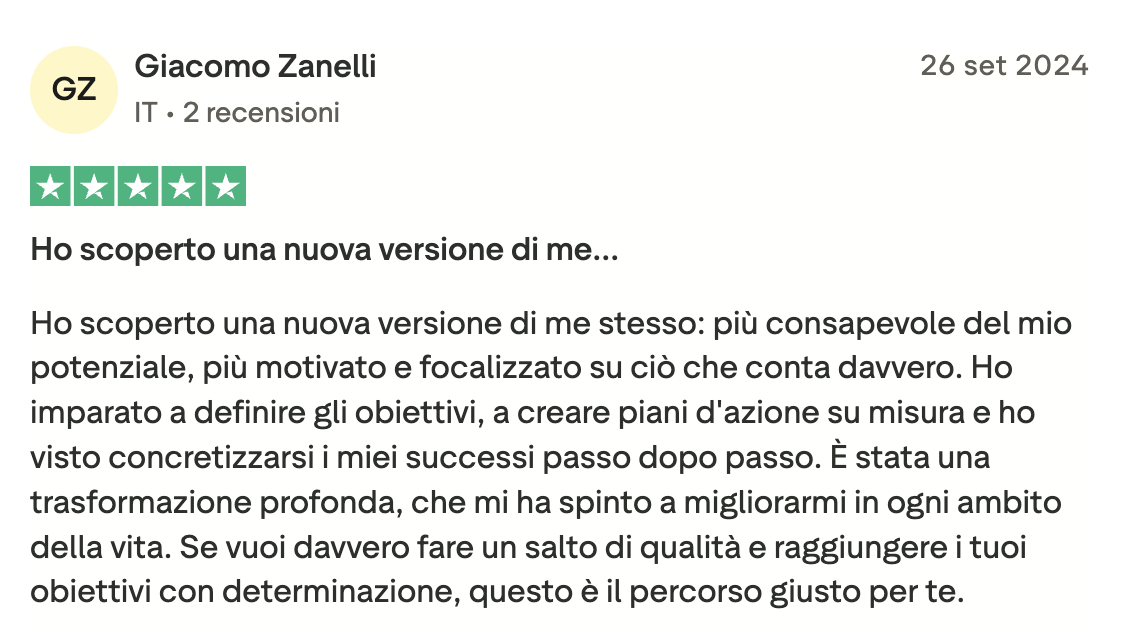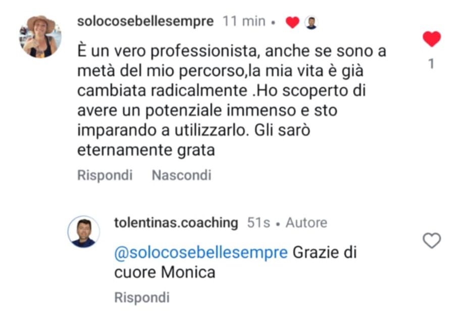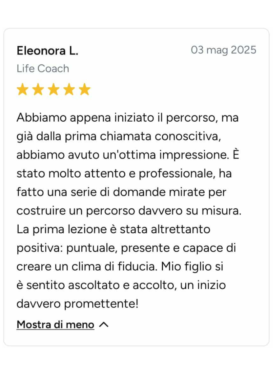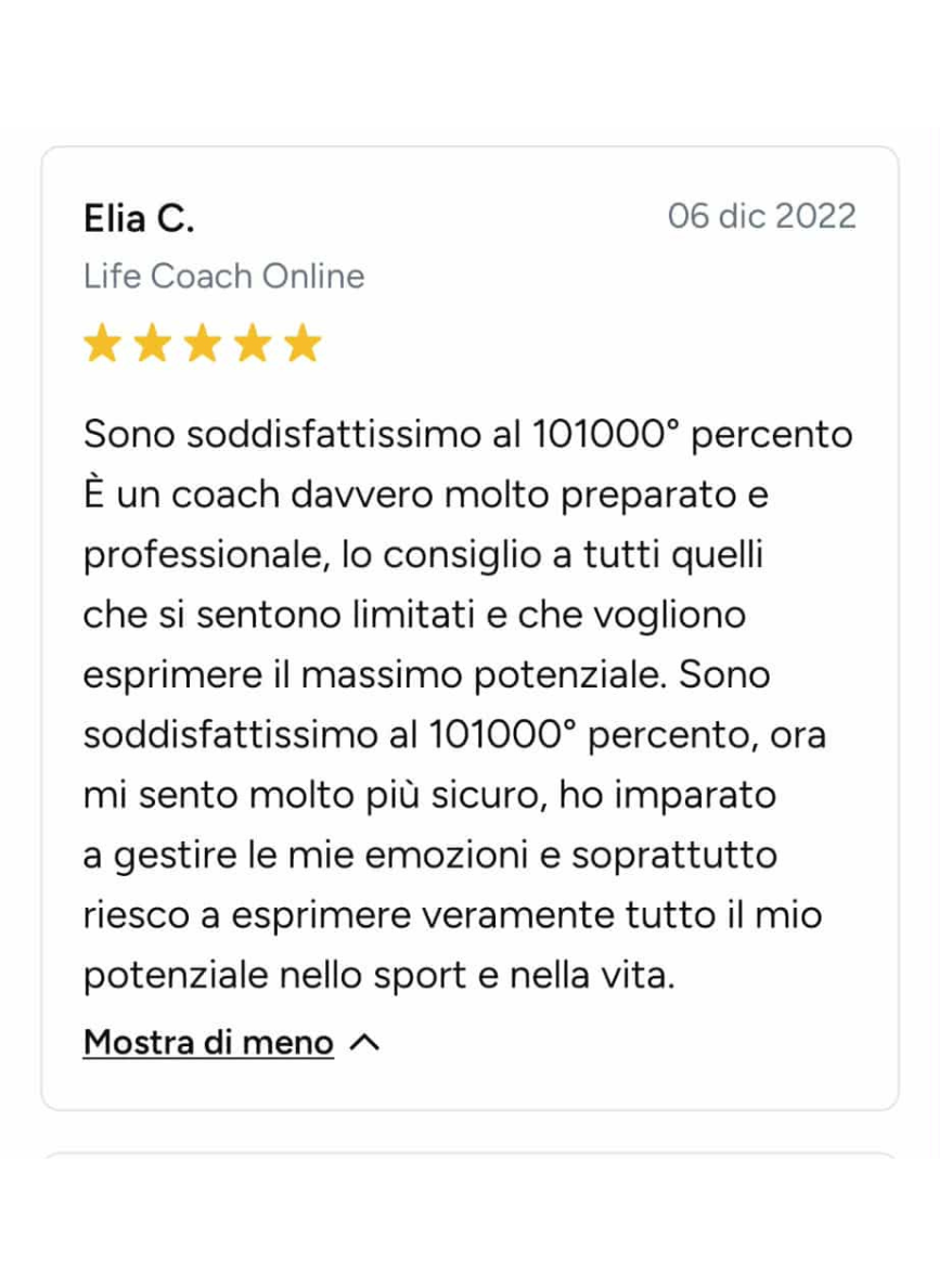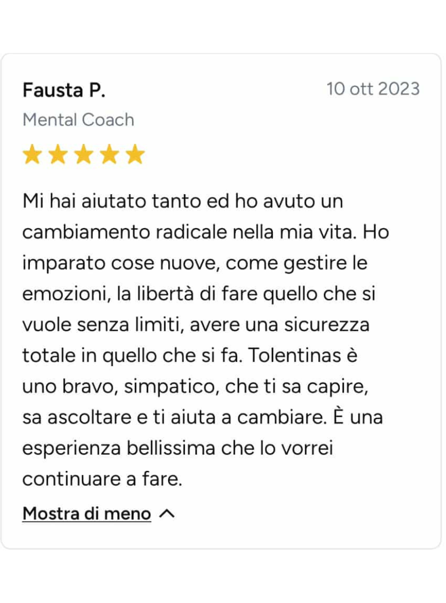 Ero bloccata, ferma in un loop e vedevo solo nero. Sembra esagerato, ma non lo è: Angelo mi ha fatto rivedere i colori! Non li vedevo da tanto tempo. Sono molto più propositiva, penso più positivo ed è tornata la speranza. Ve lo consiglio, vi aiuterà molto. In soli 15 giorni mi ha aiutato veramente tanto.